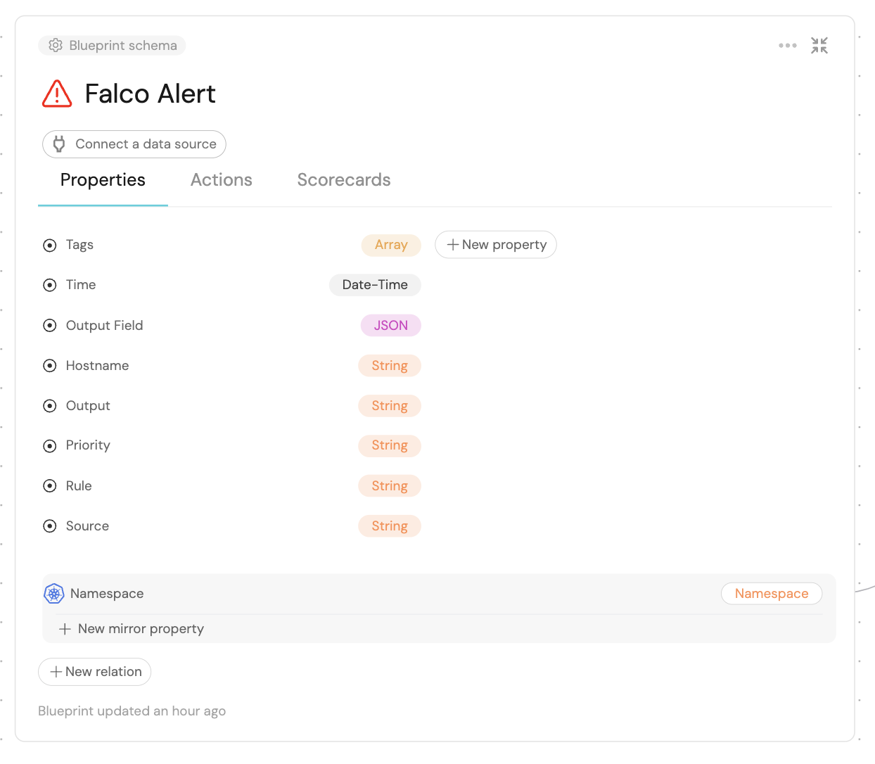 Now that the blueprints are related, we need to assign the relevant Falco to their respective namespaces. This can be done by adding some mapping logic. Go to your data sources page, and click on Falco Alert:
