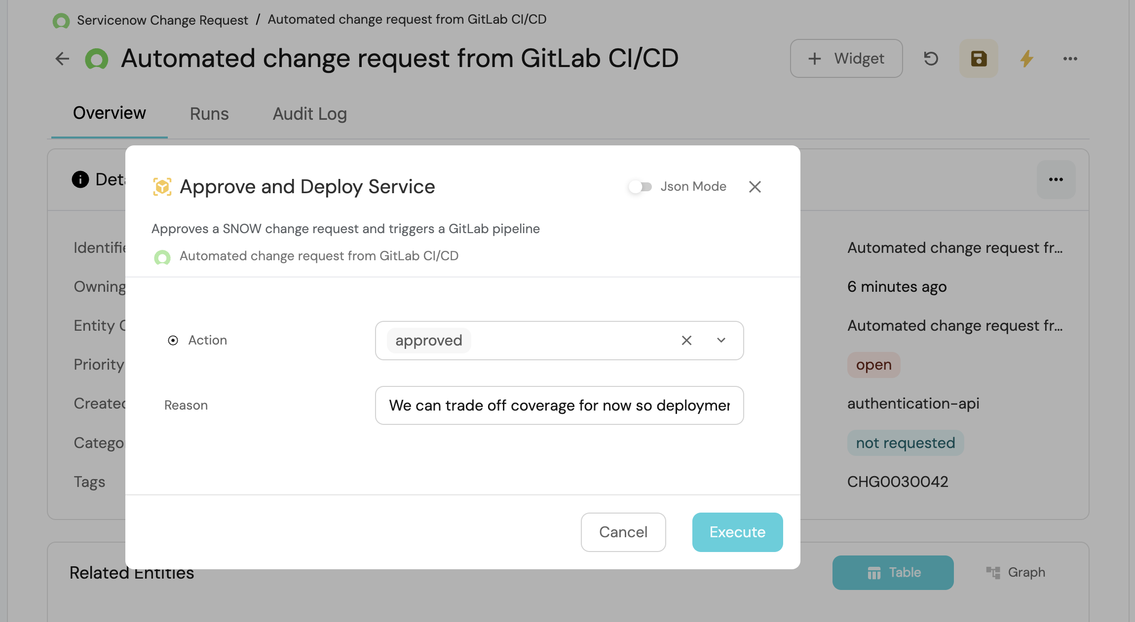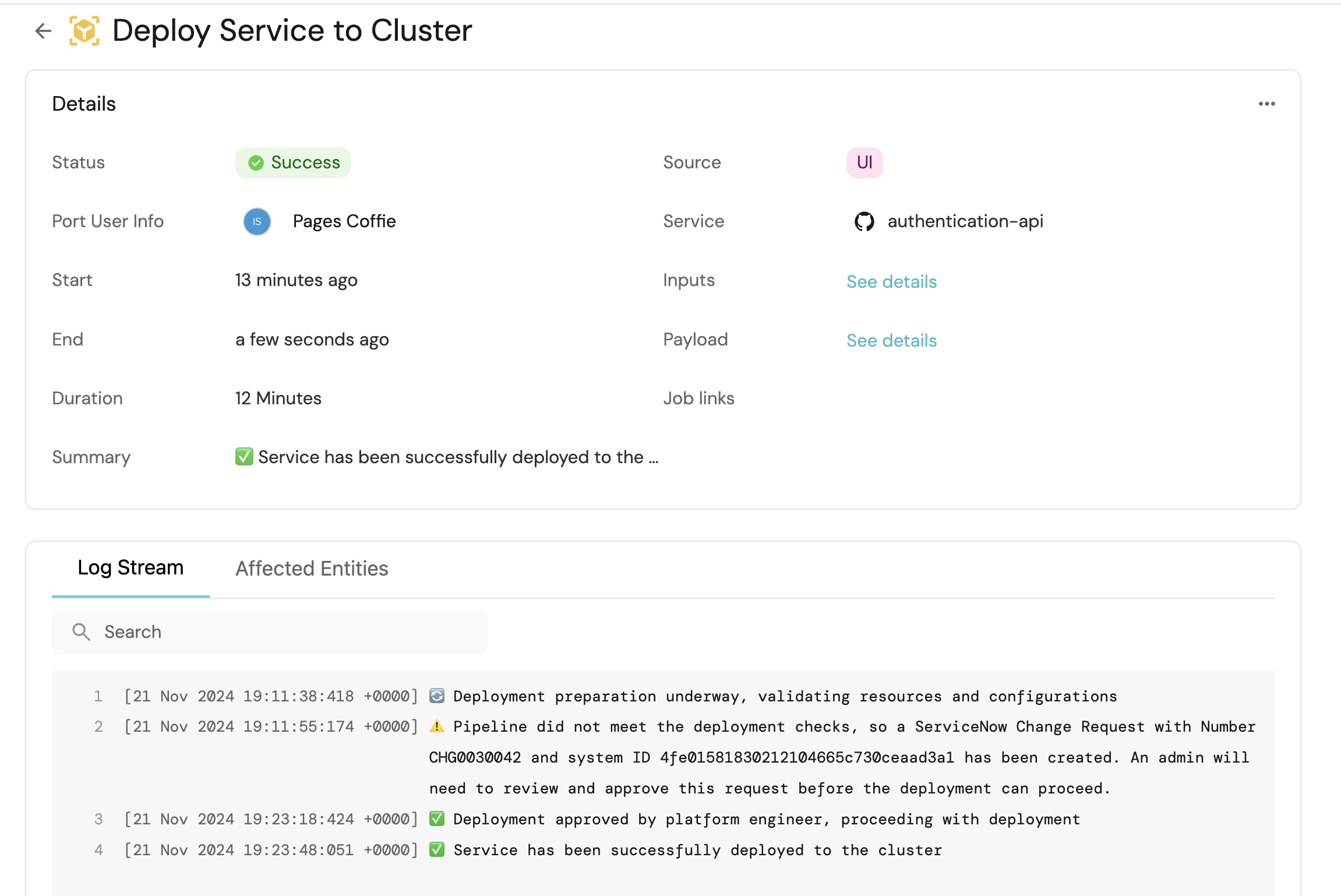 - CR decisions in ServiceNow UI trigger Port automation to update the pipeline.