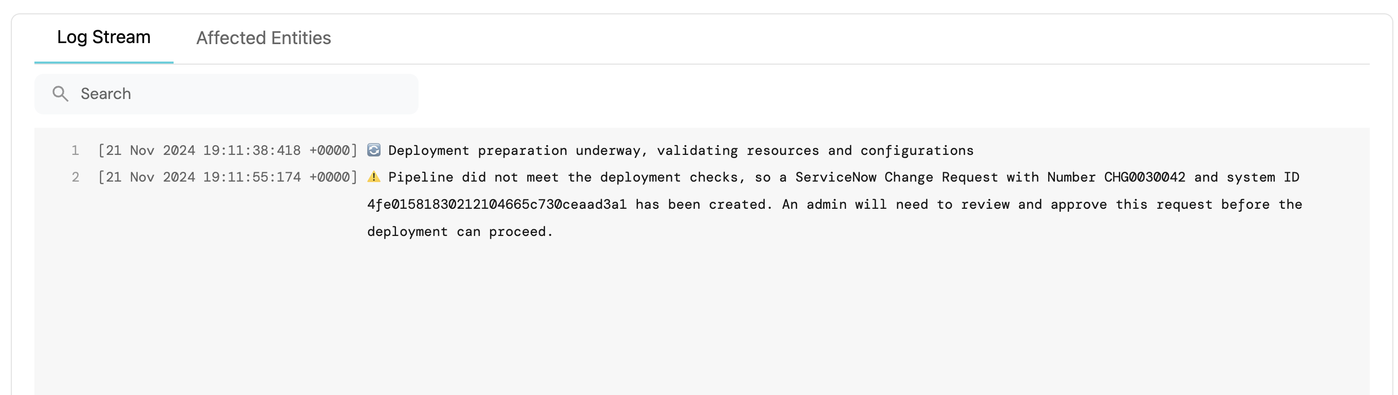 logMessage="โ ๏ธ Pipeline did not meet the deployment checks, so a ServiceNow Change Request with Number $changeNumber and system ID $changeSysId has been created. An admin will need to review and approve this request before the deployment can proceed."
